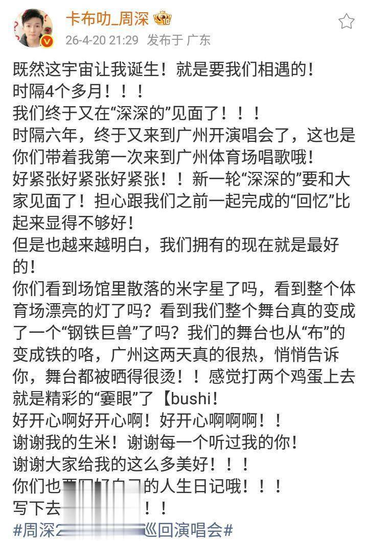 一时间,周深重庆演唱会消息,话题阅读量达到2亿!这一话题互动量达到463万,讨论量297.2万!话题在榜时长40分钟。这就是周深重庆演唱会的关注度!周深的高人气,再次得到了证明!值得一提的是,在4月21日这一天的晚上,歌手周深在广东发文,篇幅好长!周深提及自己时隔六年,又来到广州开演唱会!